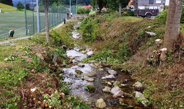 Auf Initiative von Matthias Buchholz und Oliver Becherer wurden am Samstag, den 22.08.2020, Hecken und Gestrüpp am Bach entlang des Sportplatzes beseitigt. Im Vorfeld musste geklärt werden, ob und was überhaupt geschnitten werden durfte. Vor allem mit der Familie Sattler, Inhaber der ehemaligen Gaststätte zur Krone, war vorab zu besprechen, ob die gesamte Fläche entlang des Parkplatzes bearbeitet werden darf. Die Familie Sattler bestätige, dass die gesamte Fläche in ihrem Besitz ist und gab grünes Licht, entlang der gesamten Parkplatzlänge den Bach vom üppig wuchernden Gestrüpp zu befreien.
