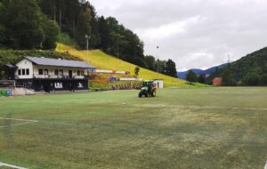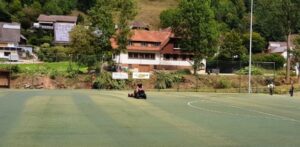 Parallel zu den Arbeiten am Bach wurde an diesem Samstag frisches Granulat in den Kunstrasenplatz eingearbeitet. Mit dem kleinen Traktor der Stadt Wolfach, der ein Streuwerk angebaut hatte, konnte ein ganzen Bigpacks Granulat einfach und gleichmäßig auf dem Platz verteilt werden. Anschließend wurde mit dem FCK-Traktor und einem Besen über den Platz gefahren, um das verteilte Granulat noch besser verteilt. Nachdem der Platz soweit mit neuem Granulat präpariert war, wurde er mit Zinken, die in den Kunstrasen greifen, zusätzlich aufgelockert, so dass für die nächsten Heimspiele gute Platzbedingungen herrschen sollten.