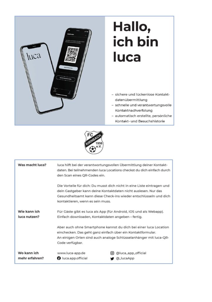 Um in Zukunft die Kontaktnachverfolgung zu erleichtern nutzt der FC Kirnbach ab sofort die Luca-App! Luca App